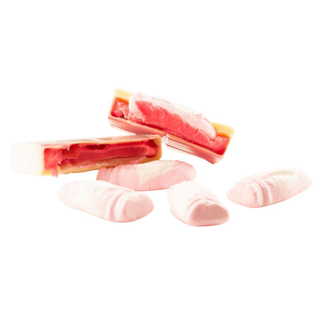 Ingredienser: Socker, kakaosmör, mjölkpulver, helmjölkpulver, skummjölkpulver, emulgeringsmedel (solroslecitin) naturlig vaniljarom, hallon, syltsocker, invertsocker, glykos (stärkelse av vete), gelatin, syra (citronsyra), vegetabiliska oljor (kokos, raps),