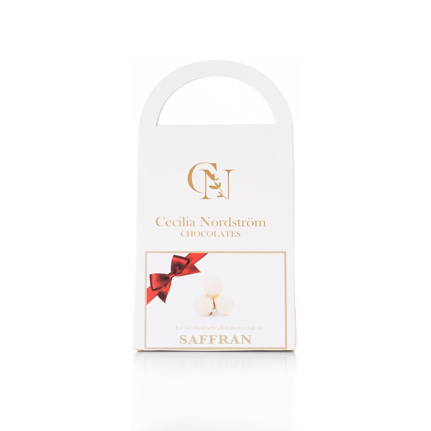 Tryffelkulor i vitt chokladskal, fyllda med len saffransganache.