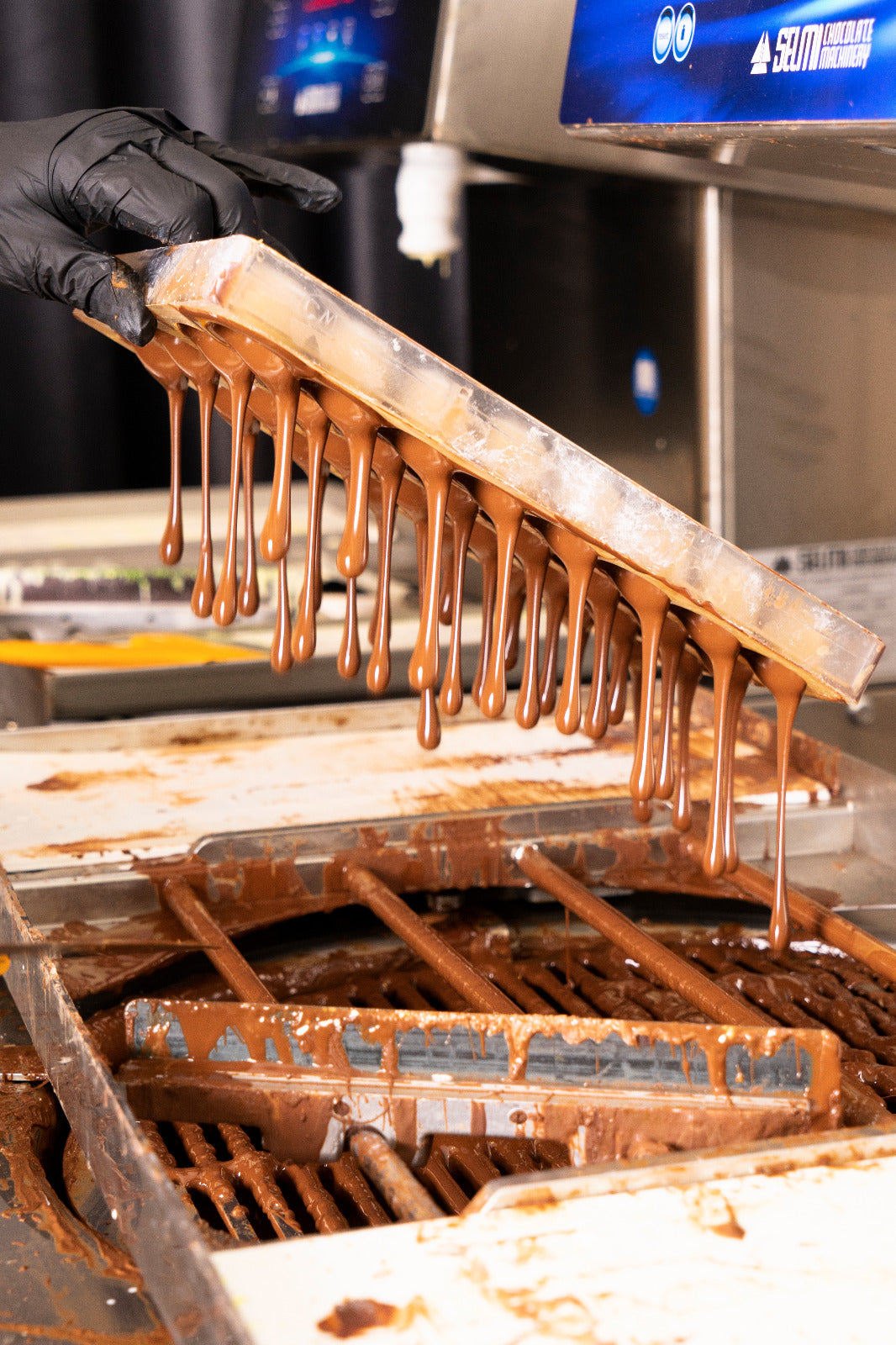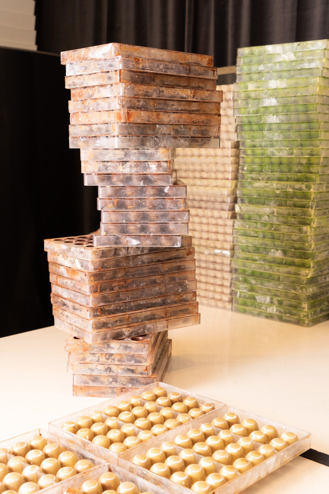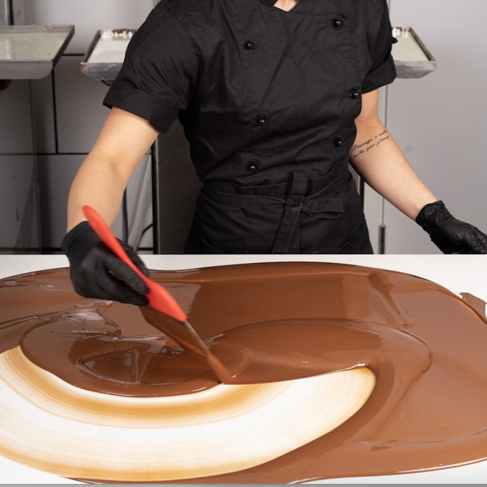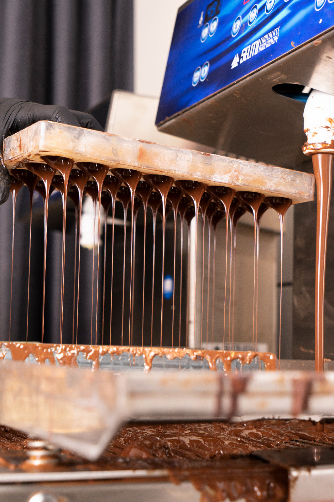 Hos oss är praliner inte bara choklad – de är små konstverk som skapats med kärlek och massor av omsorg. Vi börjar med att måla varje pralin för hand, som små juveler som nästan är för vackra för att äta (men vi lovar, de är till för att avnjutas!). Sedan gjuter vi skalen på traditionellt sätt och fyller dem med våra noga framtagna fyllningar, kokade vid spisen efter våra alldeles egna recept.
